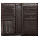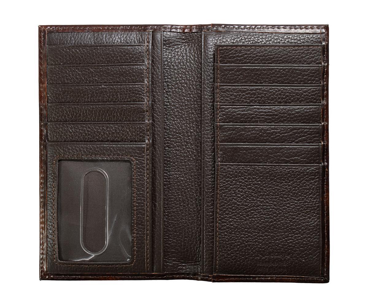 This Nocona rodeo wallet by M&F Western Products has a brown leather body with floral embossing. Multiple card and cash slots, checkbook slot and ID window on the inside.