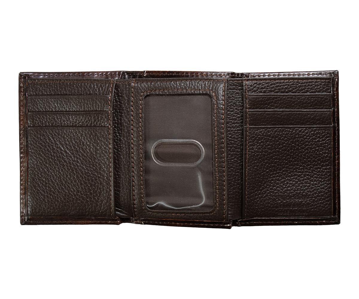 This Nocona trifold wallet by M&F Western Products has a brown leather body with floral embossing. Multiple card slots, cash slot and ID window on the inside.