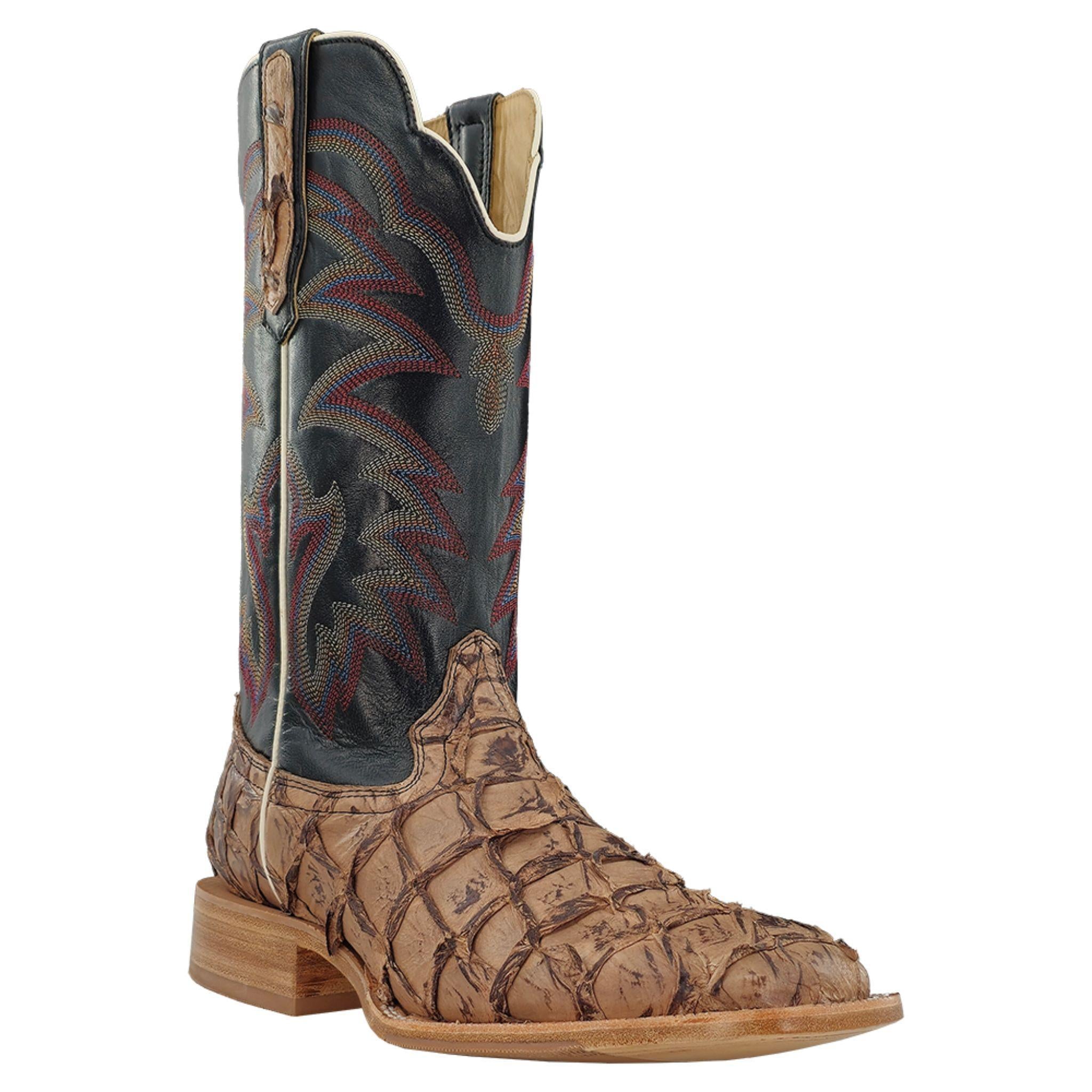 R. Watson presents these pirarucu western boots. These boots have a 10 row stitch pattern, R. Watson comfort system, all leather stacked heel, counters, solid steel shank, and hybrid outsole. 13″ total in height