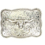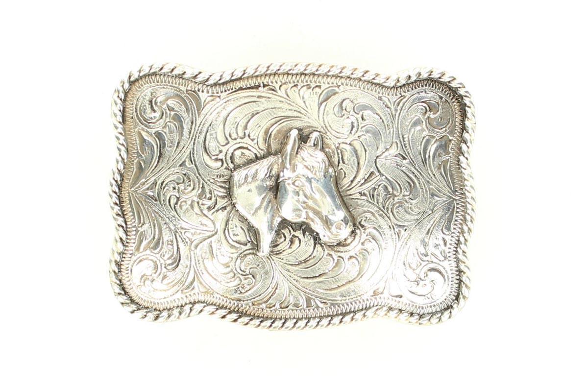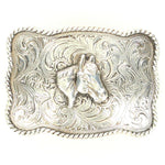 The Crumrine rectangle buckle with cowboy prayer motif and antique silver finish offers classic styling and a traditional look to any buckle collection.
