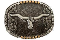 Add a distinctive touch to your belt with this Crumrine buckle by M&F Western Products. Long horn motif in the center of the buckle. Antique Gold beads on the edge.