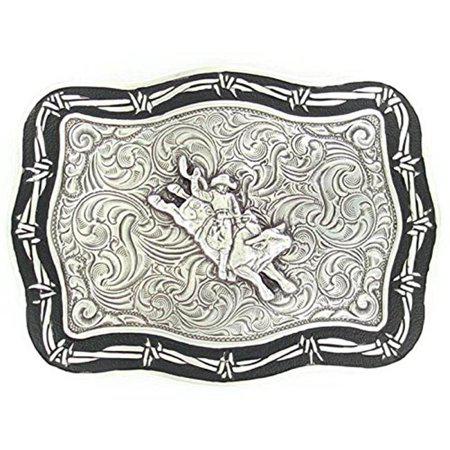 The Crumrine Mens MF and Black Bull Rider Buckle Silver is a unique and vintage accessory that will add a stylish touch to any outfit. Made with silver, this buckle features barbed wire edging, a scroll design background, and a bull rider motif. The rectangle shape measures 3-1/4 x 4-3/4, making it the perfect size to pair with your favorite pair of jeans or dress pants. With its vintage look and intricate design, this Crumrine buckle is a must-have for any fashion-forward individual.