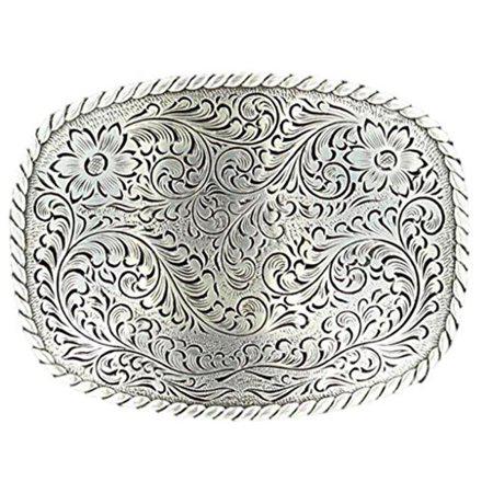 Nocona mens western buckle by M&F Western Products features a silver floral engraved oval shaped buckle with a rope edge. Measures: 2-3/4 x 3-3/4.