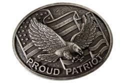 Beautifully designed Nocona buckle by M&F Western Products. The oval buckle has American Flag background with an eagle motif and the words Proud Patriot across the bottom. Dark Antique Silver.