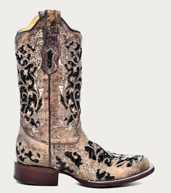 Corral Women's Black Glitter Inlay Floral Overlay w/Crystals and Studs Square Toe Brown Cowboy Boot
