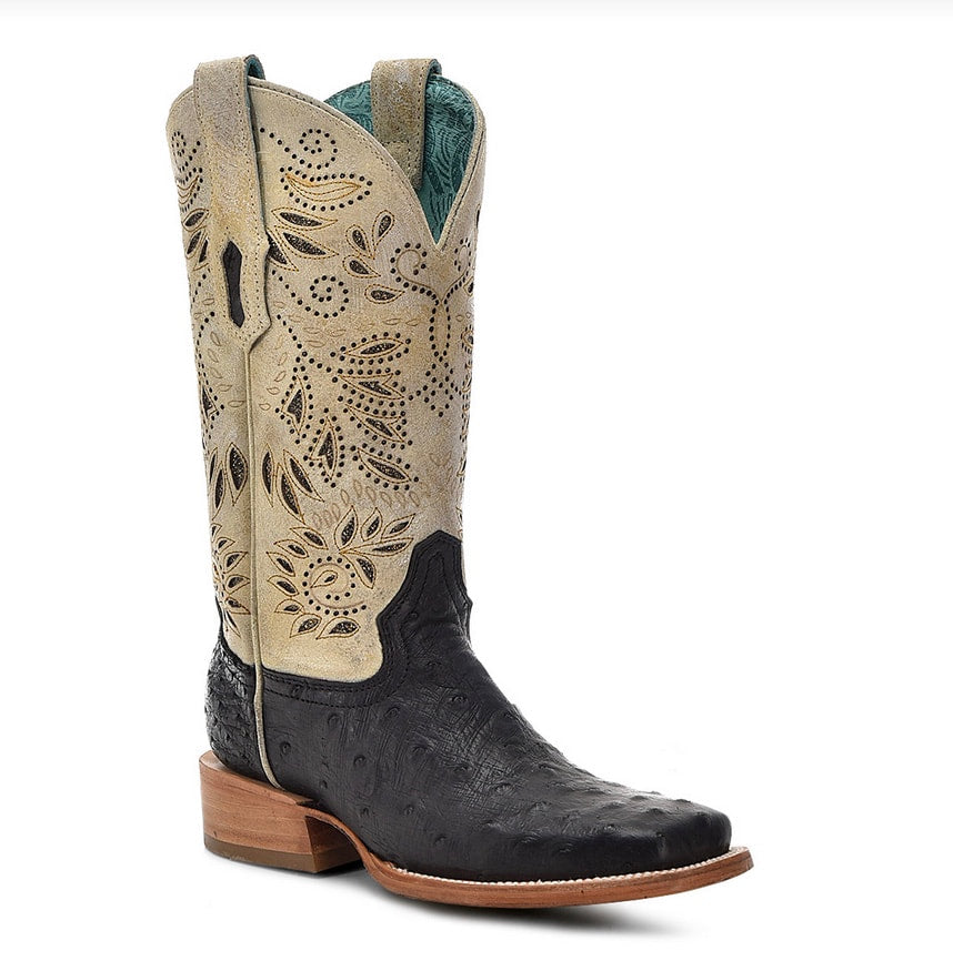 Corral Women's Black/Bone Ostrich Embroidery & Glitter Inlay Wide Square Toe Boot