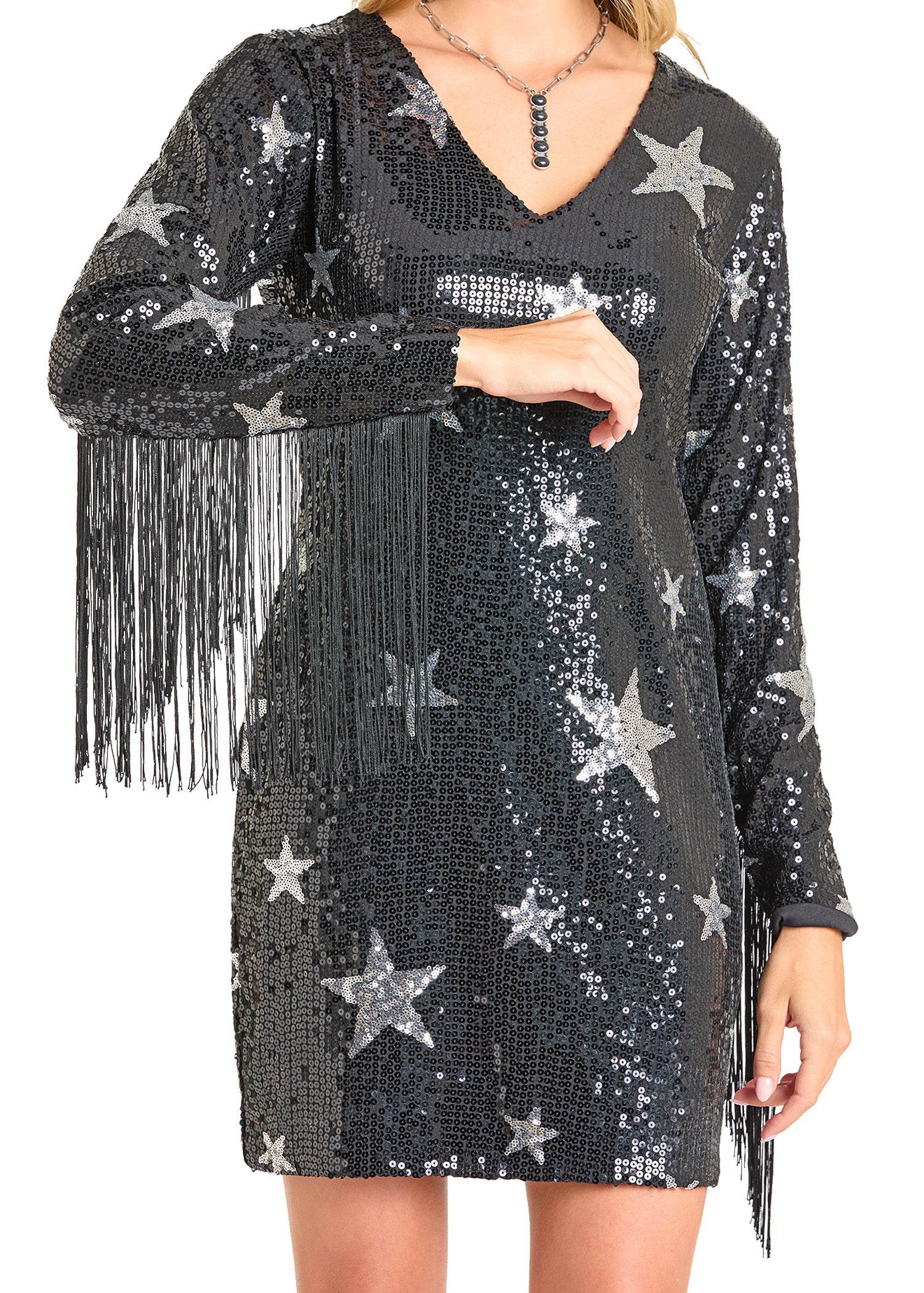 Rock & Roll Denim BWD2R07024 Sequin Star Dress w/Fringe Black