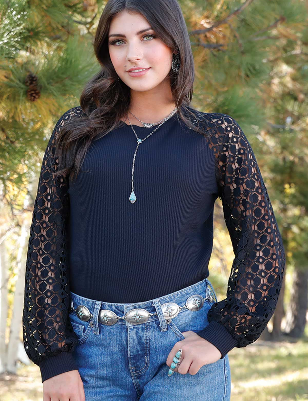 Cinch Women's Long Sleeve Lace Top 9/25 Brown