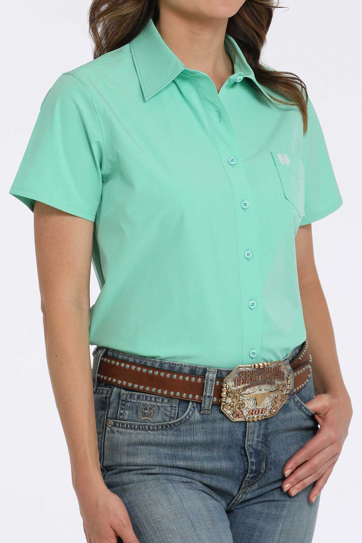 lightweight solid poly-spandex • s/s button-down mint green buttons