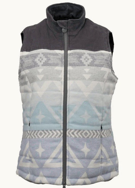 The Millie Vest brings cozy warmth and western flair with its bold blue-and-white Aztec pattern. Made with a 100% cotton shell and insulated with soft polyester fill, it’s the perfect layer for crisp days.